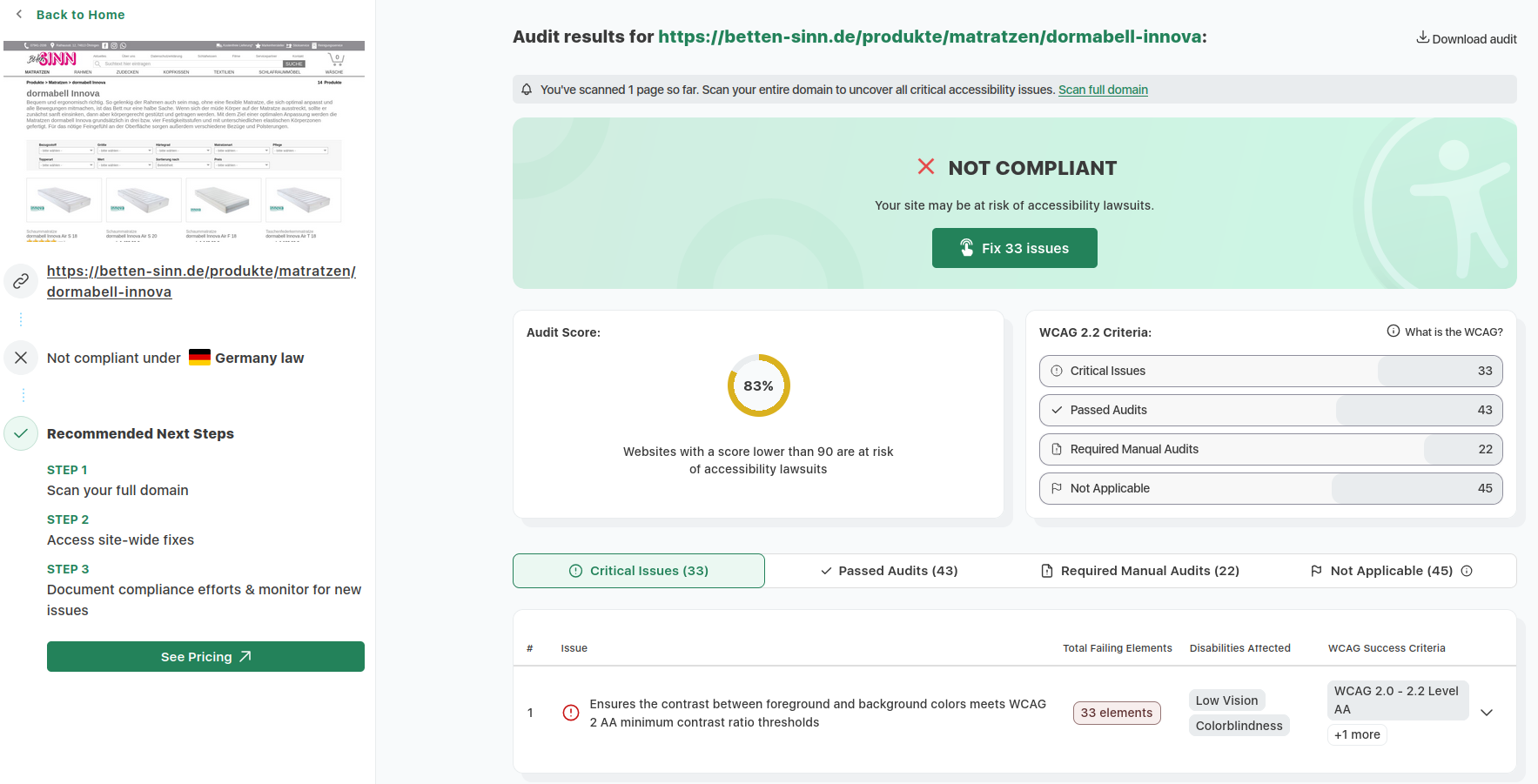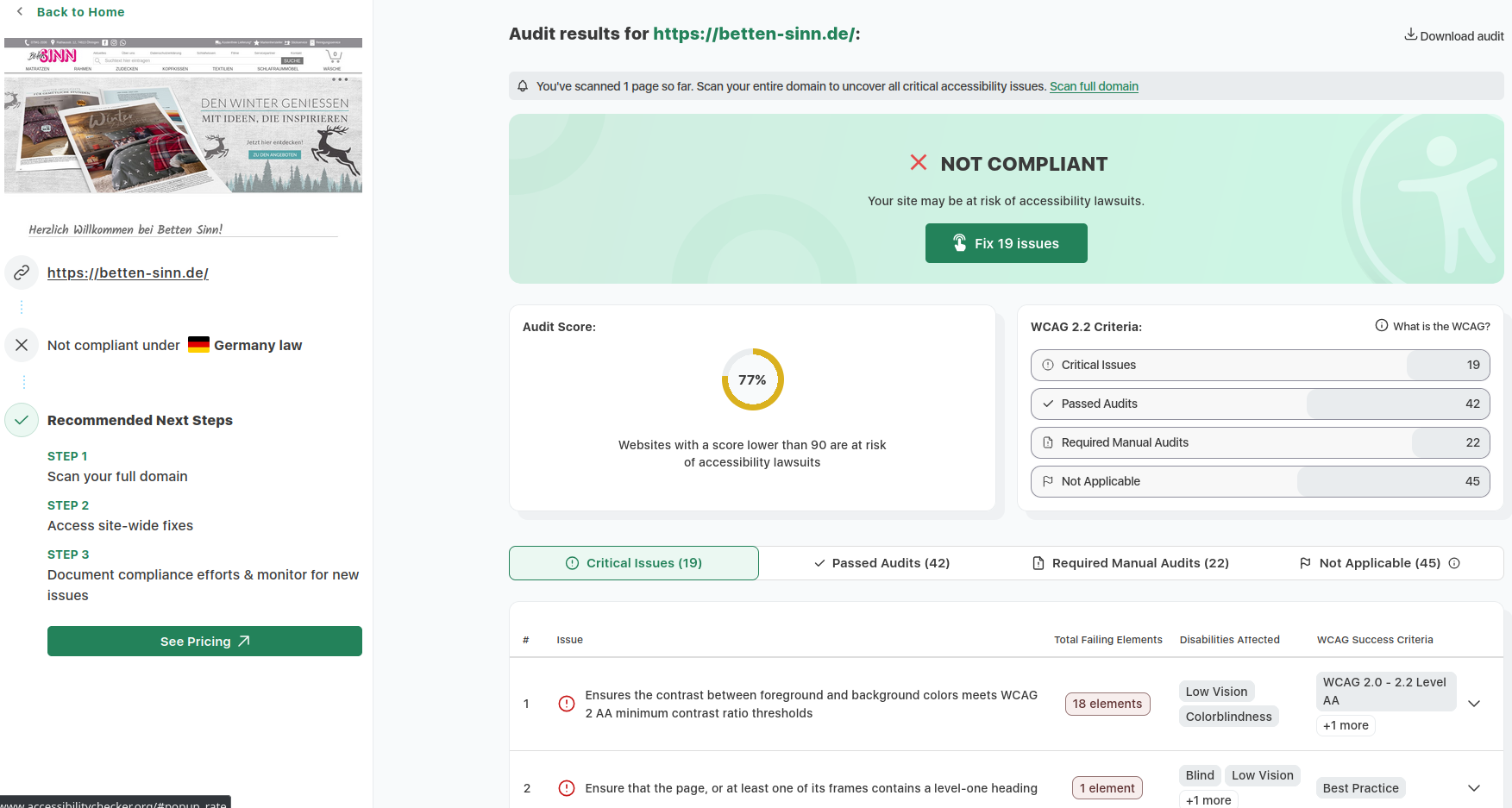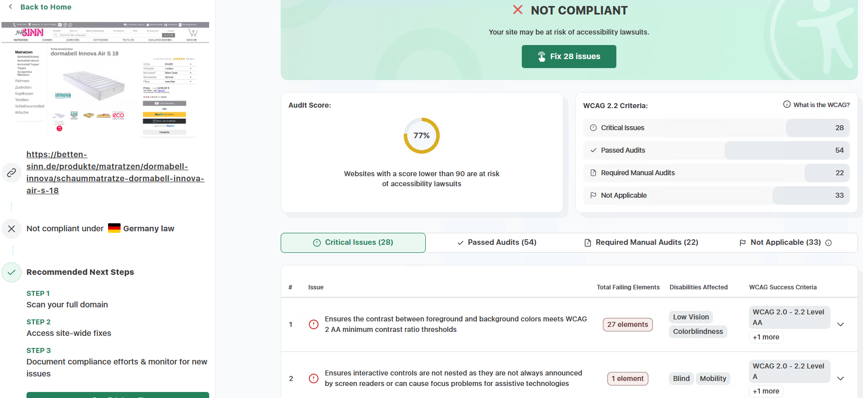 Zur Veranschaulichung unserer kontinuierlichen Überprüfungen der Barrierefreiheit haben wir Ergebnisse aus dem etablierten Tool accessibilitychecker.org dokumentiert. Diese Screenshots illustrieren exemplarisch identifizierte Barrieren sowie die erzielten Fortschritte. Im Folgenden finden Sie drei ausgewählte Screenshots solcher Prüfungen: